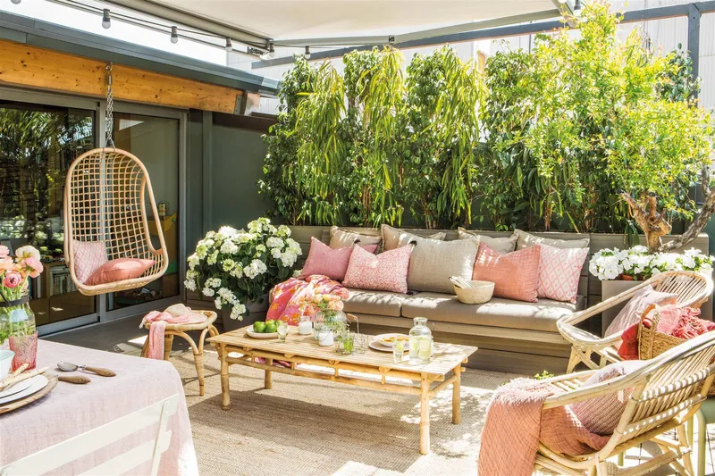 Las plantas son esenciales para crear un ambiente fresco y acogedor en tu jardín o terraza. Elige una variedad de plantas frondosas, flores coloridas y hierbas aromáticas que se adapten a las condiciones de luz y espacio de tu exterior.